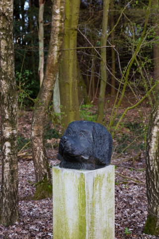 In seiner Ausrichtung danach, was die Natur an Ausblicken zu bieten hat, Bodenmodellierung und Anordnung der Pflanzen, den Raumstrukturen, gleicht das Tal einem Englischen Landschaftsgarten des 18. Jahrhunderts. Die Engländer sind große Hundeverehrer, auch hier gab es schon Hundegräber. Grab- und Denkmäler für Tiere entstanden, nachdem sich seit der ersten Hälfte des 18. Jahrhunderts zahlreiche Gartenbesitzer in ihren Garten- und Parkanlagen beisetzen ließen³, eine Verbindung, die weit zurück bis in die alten Hochkulturen reicht.⁴ Der junge Lord Byron ließ seinem Hund Boatswain 1808 im Gartendes Familienanwesens in Newstead Abbey (Nottinghamshire) ein Grabmonument mit Epitaph errichten.⁵ In Ludwigslust in Mecklenburg-Vorpommern gibt es ein repräsentativ gestaltetes Gartengrab für das verstorbene Lieblingspferd des Herzogs Friedrich Franz I. von Mecklenburg-Schwerin. Schon Friedrich II. von Preußen hatte beabsichtigt, sich auf der obersten Gartenterrasse von Schloss Sanssouci im Kreise seiner verstorbenen Hunde begraben zu lassen. Tiere, die für ihre Besitzer von emotionaler Bedeutung waren, wurden und werden mit eigenen Porträts und Biografien als Individuen charakterisiert und verehrt. Ein jüngeres Beispiel ist ein Hundegrab im Garten der Villa Wahnfried am Rande des Bayreuther Hofgartens: »Hier ruht und wacht Wagners Russ«, Richard Wagners Hund, übrigens auch ein Neufundländer. Der Bildhauer Ottmar Hörl hat ihn in seiner Arbeit Wagner’s Hund 1.000 Mal in Kunststoff gießen lassen. Ratibor bleibt einzigartig. Und er hat nicht nur ein literarisches und ein plastisches Denkmal erhalten, in der Skulptur von Frank Herzog nimmt er es locker mit einem ganzen Skulpturenpark auf.