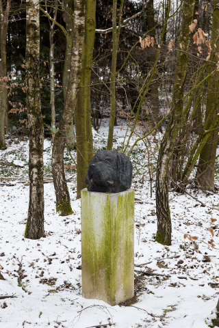 Frank Herzog bannt die Erinnerung an ein Tier, das es wirklich gab, das lieb gewonnene Wesen Ratibor. Kopf und Sockel bilden eine Einheit, erreichen eine Größe, die fast Menschenmaß hat, unterstreichen so die Bedeutung des Hundes für seine Besitzer. Der mächtige Kopf wirkt real und irreal zugleich, ähnlich dem großen und kleinen weißen Pferd von Johannes Brus auf der Höhe der Anlage ›im Tal‹. Auch die humorvollen Figuren von Fritz Schwegler Glockenfuß und Vasenkopf könnten sich aus ihrem Versteck im Wald, der Mihr zu Ratibor bewegen wollen. Diese erinnern mich an Frank Herzogs ›Vasenköpfe‹ in der Zusammenführung von Hund und Vase bei den erwähnten Fräulein-Vasen. Köpfe, die aus einer Vase auftauchen, können auch wieder darin verschwinden. Auch der Betrachter verschwindet wieder, er macht sich auf den Weg, verlässt den Verweilraum, den Gedenkort für Ratibor, und begibt sich zu Heinrich Brummacks Ort der Harmonie, der in ganz anderer Weise, in ›lauter Stille‹ zum Verweilen lädt. Hier erhascht er zwischen den Bäumen hindurch noch einmal einen Blick auf Ratibor.