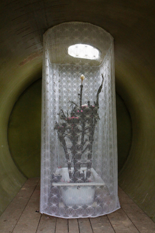 Innen und innerhalb des Vorhangs sieht man in der mit schwarzen Streifen und Teerklumpen verschmierten, teilweise davon bedeckten und damit ihrer ursprünglichen Aufgabe enthobenen Badewanne ein amorphes pflanzenähnliches pechschwarzes ›Etwas‹. An manchen Stellen reflektiert das tiefe Schwarz durch die einfallende Sonne das Licht. Wie Äste windet und streckt es sich nach oben. Mehr und mehr formt eine tropfende und triefende Teermasse ein fast undurchdringliches krusten- und netzartiges Geflecht. Zufällig entstandene Querstreben stabilisieren das fragile Objekt. Auf dem Weg nach unten bildet die zähe Teermasse an einigen ›Ästen‹ tropfenförmige Kokons aus. Wie auf Händen trägt die Baumkrone grelle pinkfarbene Blüten und erotisierende Knospen, die sich in unförmigen, ebenfalls mit Teer überzogenen, Blütenkelchen ähnlichen Schüsselchen, befinden. Und über allem ragt auf der korallenartigen Spitze eine goldfarbene Blüte: es ist die Krone des Lebens.