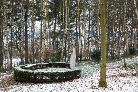 ›Im Tal‹ inmitten ihrer konkreten landschaftlichen Umgebung bleibt diese ästhetische Reflexion ein mögliches Thema der Skulptur, die unmittelbare Wirkung des ›vielseitigen‹ Standbilds zielt auf die räumliche Orientierung des Betrachters. Im Gegensatz zu einer homogenen figürlichen Außenplastik, die selbst dann, wenn sie den Betrachter zur Bewegung auffordert, als integrative Einheit die Wahrnehmung bündelt, herrscht hier der Eindruck des Disparaten, der durch die Gestaltung des Plateaus noch verstärkt wird. Als scheinbar souveränes Denkmal beherrscht die Skulptur ein mit Eiben eingefaßtes kreisförmiges Areal. Doch das, was sich in dem Rund aufeinander beziehen müßte, beachtet genausowenig die Regeln solch einer Platzanlage, wie sich die einzelnen Aspekte der Skulptur zu einer anschaulichen Einheit zusammenfügen. Die Skulptur steht exzentrisch und nimmt daher innerhalb der Grundfläche keinen idealen Standpunkt ein. Die aufgestellte Steinbank, die mit ihren Kugelfüßen barocke Formen zitiert, richtet sich auf keine ihrer Ansichten, sie steht weder axial zur Vorderansicht noch reicht sie weit genug, um von ihr aus eine der beiden Profilfiguren zu überschauen. Die Funktionslosigkeit des vermeintlichen Ruheortes erhöht die Rastlosigkeit des Vorbeikommenden, dem sich die Gesamterscheinung nur durch eine sukzessive Auseinandersetzung mit Einzelaspekten erschließt. Er kann sich entweder mit der Männerfigur oder mit der Frauenfigur in Beziehung setzen, niemals mit beiden gleichzeitig. Obwohl deutlich erkennbar ist, daß die beiderseitigen Profillinien im Relief der Vorderansicht ineinanderfließen, ergibt sich aus dieser Synthese eine unbestimmte, anonyme Gestalt, die keinerlei Verbindung herstellt. Gänzlich unabhängig von den seitlichen Darstellungen besitzt ihre seltsame Unergründlichkeit etwas von der Suggestionskraft einer fremdländischen Kultfigur. Durch die Vereinzelung der Ansichten verliert der Platz die Funktion eines intimen Aufenthaltsortes, der sich auf die gesammelte Anschauung eines Denkmals ausrichtet. Der offene Charakter des umschlossenen Platzes wird ebenso dadurch manifestiert, daß er sich als Ausgangspunkt für außerhalb liegende Blickpunkte eignet. Der wichtigste Punkt ist sicher die zweite Skulptur des Ensembles, die der ersten höherstehenden vom Aufbau her genau gleicht. Während man die Eingegrenzte aus der Nähe betrachtet, kann die andere, die im Vergleich zu jener einsam und ungeschützt am Schneisenrand steht, nur aus der Distanz beäugt werden. Nahsicht und Fernsicht werden auf exemplarische Weise alterniert. Der Blick vom Plateau trifft wieder auf eine Dreiviertelansicht, die einsehbare Seitenansicht zeigt diesmal einen Männerakt ohne anekdotische Details. Aus der Entfernung wird sogar eine punktuelle Zusammenschau der getrennten Profilfiguren möglich. Es stellt sich ein anamorphotischer Effekt ein, wenn der Männerakt über die im Relief der Vorderansicht stattfindende Verwandlung sichtbar in eine weibliche Profillinie übergeht. Der ideale Standort für diese Sicht ist nicht gesondert gekennzeichnet er ist ein möglicher unter vielen.