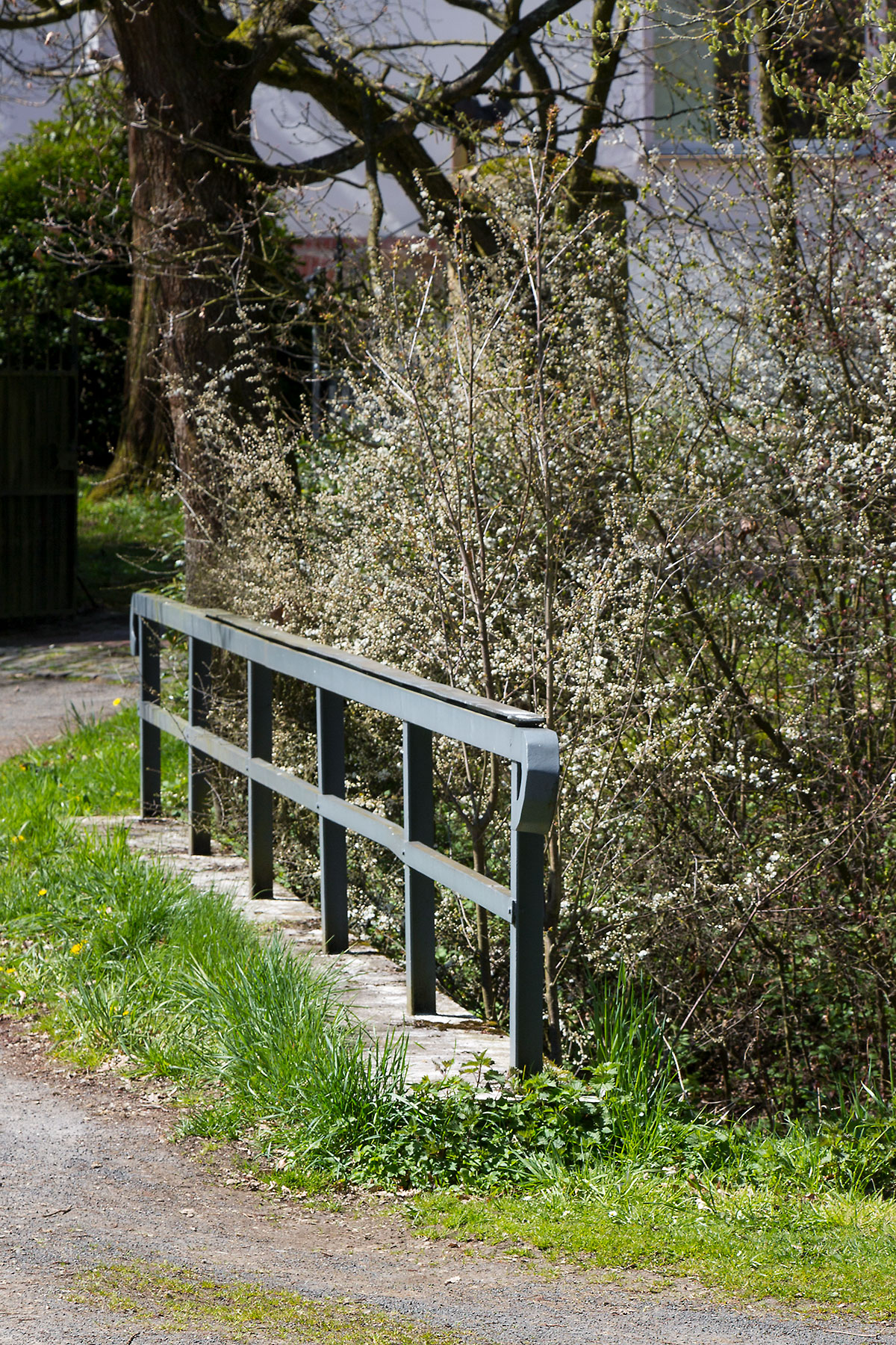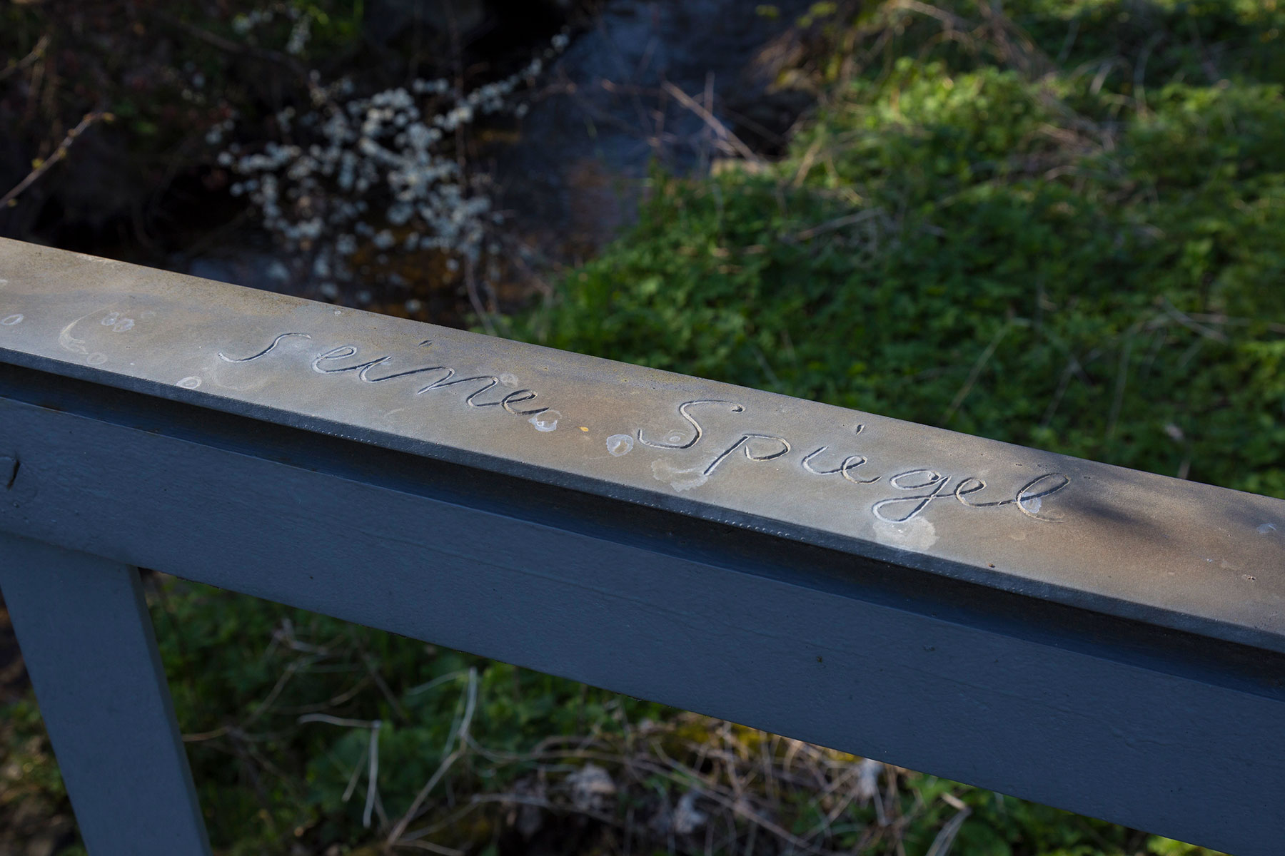 Nicht anders verhält es sich mit seiner zweiten Arbeit im ›Tal‹. Nahe des Hauses von Erwin und Ulla Wortelkamp führt eine Brücke über einen Bach. Sie liegt in einer Kurve. Ein Geländer grenzt sie nach den Seiten ab. Zumeist sind es Autofahrer, die die Brücke queren. Für sie ist es praktisch unmöglich, die Arbeit Paul Isenraths zu sehen, geschweige denn wahrzunehmen. Denn die Arbeit ist ein aufgesetzter Handlauf an dem Geländer. Leicht nur hebt er sich ab von der vorfabrizierten Höhe, bildet lediglich einen kleinen Spalt fürs Licht, schwebt gleichsam über dem Geländer. Ein bloßes Stahlband – wäre da nicht am Ende ein kleines Becken in den Stahl getrieben, in dem sich Regen- und Tauwasser sammelt; ein bloßes Stahlband mit kleinem Wasserbeckchen – mündete ins Wasser nicht ein Worteband, mündeten nicht die folgenden Worte in den Spiegel, die Isenrath zu einem Satz gebaut ins Stahlband geformt hat: Gewicht | Balance | Lage | zerfließen zum Sammeln | nachgebend | scheinbar ohne Form | formen seine Spiegel die Kräfte Beide Arbeiten von Paul Isenrath spielen mit der Flüchtigkeit, die dem Menschen eignet, wenn er spazieren, wenn er zur Entspannung in die Natur hinaus geht. Dieser Flüchtigkeit kann man etwas entgegensetzen, indem man die Aufmerksamkeit erfordert, sie erzwingt. Man kann die Aufmerksamkeit aber auch hinter der Flüchtigkeit als ein nur Verborgenes voraussetzen und ›nur‹ darauf hoffen, sie zu erregen. Letzteres tut Paul Isenrath. Ja, er erhebt dies sogar zum Kunstprinzip. Er holt den Betrachter, den Spaziergänger und Wanderer da ab, wo dieser mit offenem Auge verloren plötzlich sieht, wo dieser aus seiner Flüchtigkeit gerissen angehalten wird aufzumerken, wahrzunehmen, zu sinnieren.