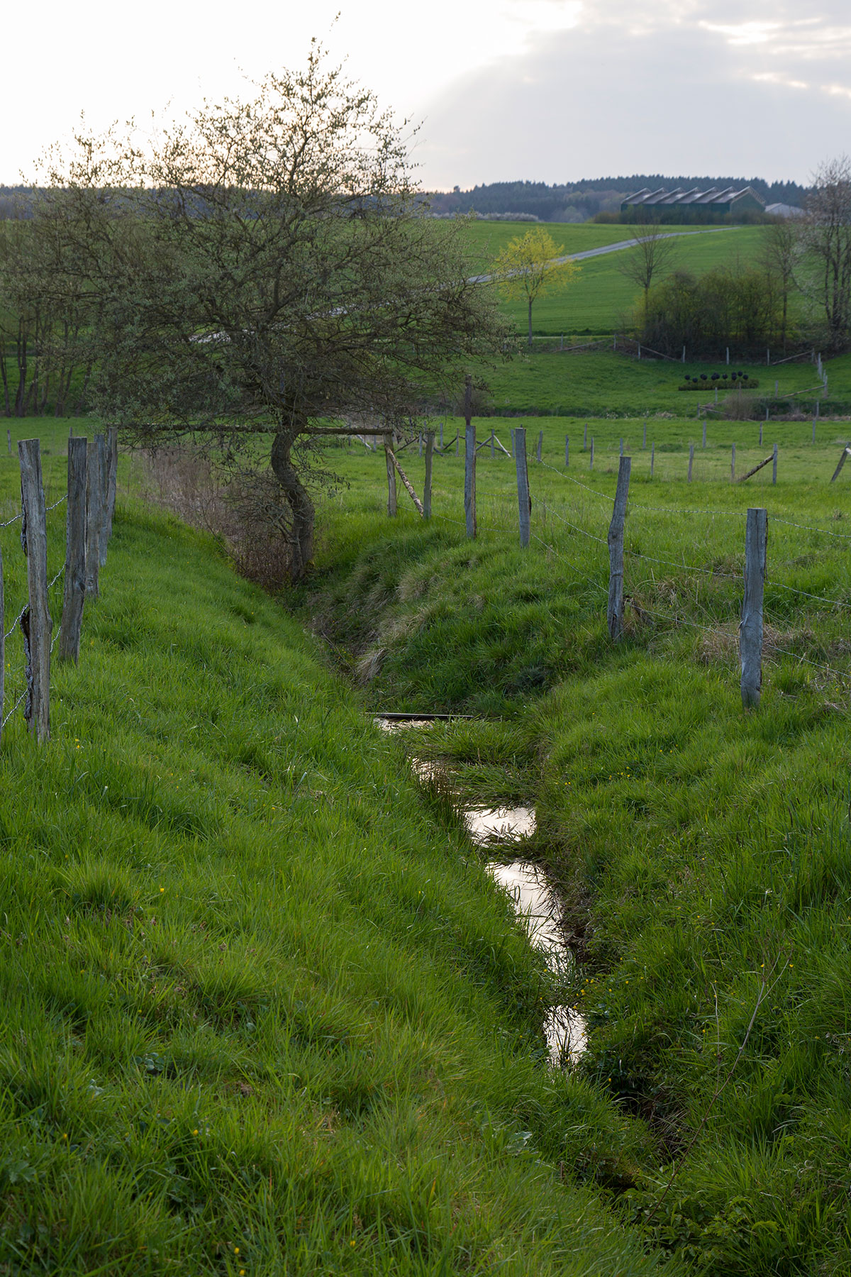 Man kann Riesiges in die Natur stellen, um sich als Künstler zu behaupten. Mitleid mit dem, der dies nötig hat. Man kann artifiziöse Strukturen konstruieren, um sie der Natur überzustülpen, solche, die die Natur gleichsam domestizieren. Wie wenig Einblick in die Komplexität der Natur und in die in ihr waltende Ordnung ist dem zu attestieren, der sich dies zum Ziel gesetzt hat. Und, man kann das Naturschöne in seiner einzigartigen Weise so genießen, schätzen und akzeptieren, daß Kunst dort konsequenterweise keinen Platz hat. Wie verhält sich angesichts dieser vertrackten Ausgangssituation nun ein Künstler, soll und will er ein Werk von sich in die Natur geben, was eben auch bedeutet, daß er in die Natur eingreift? Vilém Flusser sieht das Nehmen eines Stockes aus der Natur schon als den der ersten Akt des Menschen, sich die Natur untertan zu machen. Dem finalen Punkt, den, in dem die Natur in Funktion des Menschen funktioniert, nähern wir uns so gesehen seit Menschengedenken. Ob dieser je erreicht werden wird, ob dies überhaupt zu wünschen ist – wer weiß? Wandert man nun durch das ›Tal‹ bei Hasselbach/Werkhausen im Westerwald, in das Erwin Wortelkamp Künstler gebeten hat, Werke von sich zu platzieren, zu installieren, zu integrieren ?, so begegnet man weniger denn beiläufig – also nicht monumental den Blick richtend, aber auch nicht gerade zufällig – zweimal Werken von Paul Isenrath. Man hat sich gerade daran gewöhnt, den Blick nicht nur, auf Naturschönheit konditioniert, über Weiden und Auen schweifen zu lassen, sondern auch darauf eingestellt, Knicke in Zaun und Schneisen, vertikale Marken und Gerätschaften als Kunst in der Natur zu akzeptieren, da nimmt man, vielleicht durstig des Sommers, einen Wasserspiegel wahr. Eine Pfütze wahr – aber eine in Dreiecksform, gleichschenklig scheinend und auch noch tetraederhaft dreidimensional und stahlgewandet? Wasser fließt über den spitzen Winkel des Dreiecks, Wasser eines Rinnsals von der Weide. Die Basisfront des Dreiecks dient gleich einem kleinen Staudamm dem Halten des Wassers. In einer Ackerfurche befindet sich das Ganze. Die drei Seiten des Dreiecks liegen – wie könnte es anders sein? – in einer waagerechten Ebene. Es sind die Sichtkanten der in die Erde eingelassenen Stahlbleche. Wir stehen vor einem horizontalen Moment in der Hügellandschaft des Westerwaldes. Paul Isenrath hat eine Staupfütze in die Natur gegeben. Lediglich das Auge vermag über sie zu stolpern. Denn die Form – nur sie, nichts anderes – ist der Natur hier fremd. Das Phänomen, Wasser zu stauen und so einen Spiegel in der Natur zu bilden, in den sich der Himmel und die Wolken eben einspiegeln, ist der Natur entnommen. So tritt Blau ins Grün der Weiden, so Wolkenzüge an die Grasnarbe – hier in der geometrischen Dreiecksform. Der Künstler, der Mensch, Paul Isenrath, bescheidet sich damit, visuell, qua Form, ein Werk dem Formrepertoire der Natur einzufügen. Wenig – in der Tat. Kaum augenfällig – für wahr. Aber signifikant – was mehr ist zu erreichen?