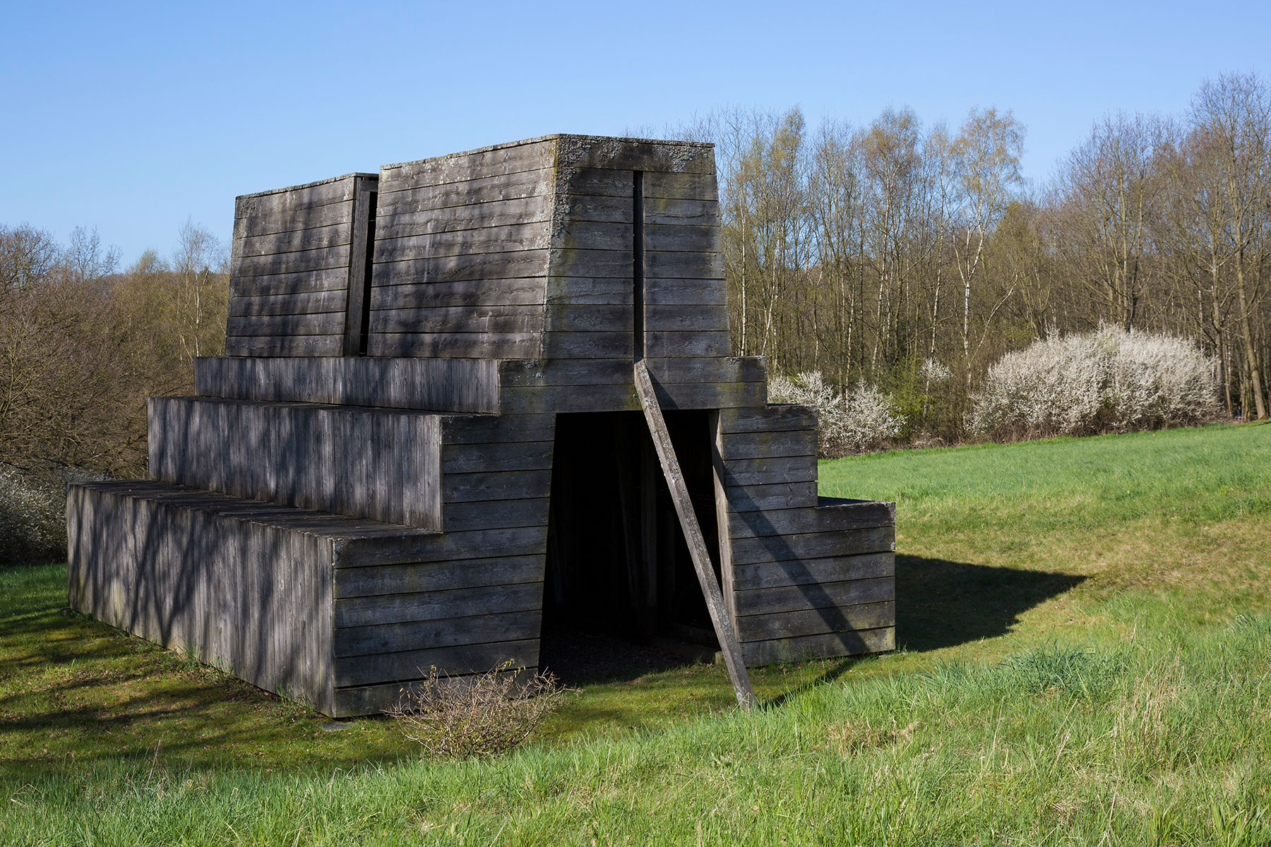 Alle wußten, warum der Hanauer ihnen so praktisch kam. Hatten sie doch nächtens die gepferchten Gäule treten und kollern gehört; denen mußte schnell eine Bleibe her. Noch länger wäre schließlich der berittenen Künstler Aufenthalt im ›Tal‹. Schon hatte Wortelkamp ein kleines Kiefernwäldchen im Blick und die nötigen Äxte und Sägen im Sinn, gab jeder das Seine krittelnd oder zustimmend dazu. Bury aber, den Kopf schon voller Grundrisse, Hochbalken und Pfetten, hielt mitten im Lauf zum Bauplatz jäh inne. Knapp dahinter, unter einem dichten Vorhang aus Efeu, trat ein Gebäunis in Erscheinung, das er in einer Vision eben auf den Platz gestellt hatte. Nun sahen es auch die anderen durch den grünen Mantel der Natur. Ein Holzhaus, getreppt und getürmt, mehr verschlossen als offen, zwei Stege stützten die Stirnseiten noch einmal ab: aus anderer Kultur dahergesetzt, aber wann? Sie schlugen es frei, rissen sich die Nägel ab. Dann war allen klar, Bury als erstem: sie alle waren schon einmal hier gewesen, vor Jahrhunderten. Bury holte den Rappen, stapfte durch den neuen Schnee und führte den Gaul an einen pferdekopfhohen Balken in dem Stalle, den er (er?) vielleicht vor dreihundert Jahren hier errichtet hatte. Der Pferdebiß an der alten Nagespur paßte.