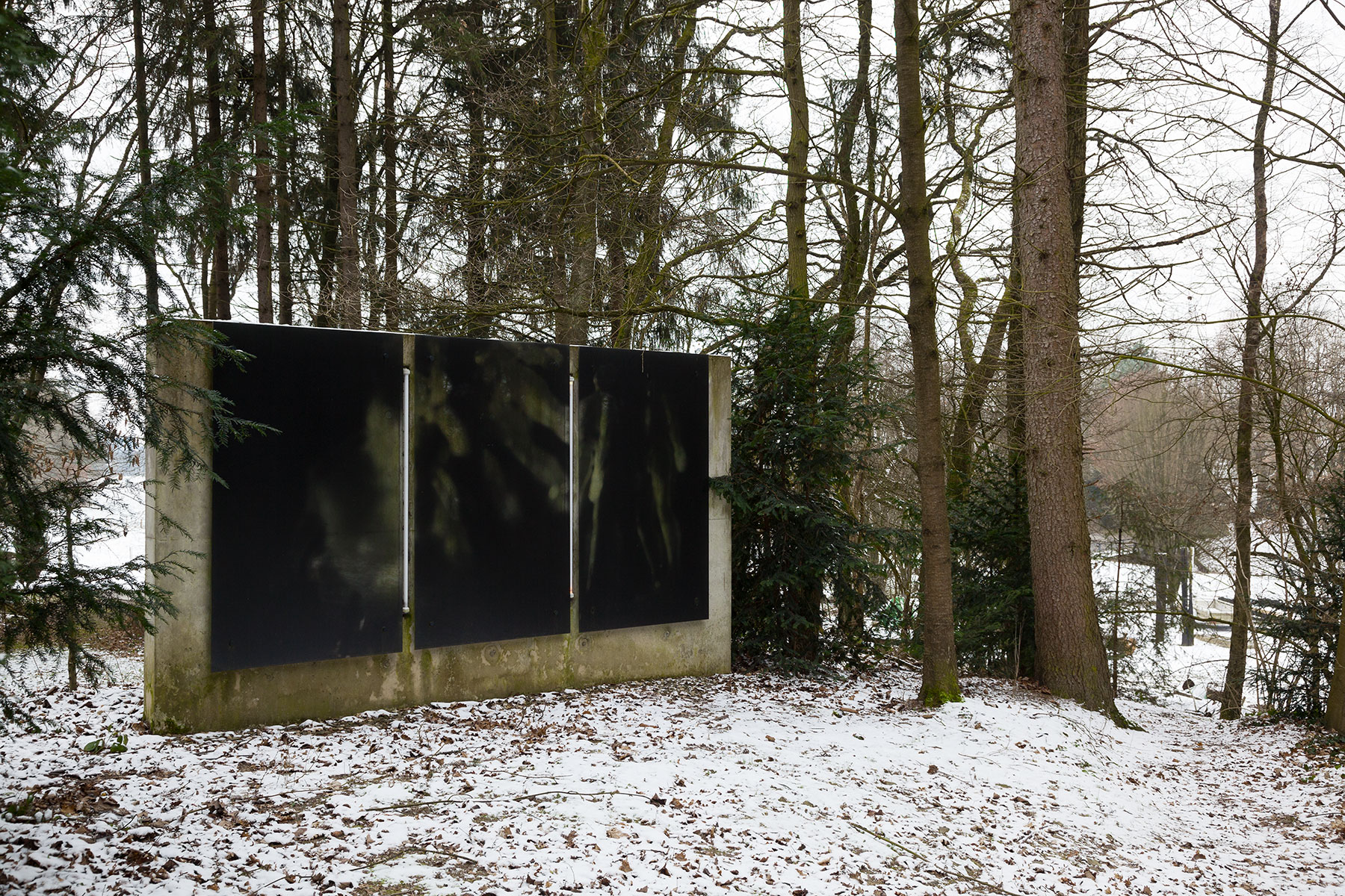 Für ihre bislang einzige Arbeit im Außenraum hat Krimhild Becker einen kongenialen Ort gewählt. Eine Lichtung im Waldstück, die den Blick frei gibt auf den angrenzenden Friedhof. Es ist ein Ort des Innehaltens und Verweilens, des Sinnierens und des Ahnens. Gleichzeitig handelt es sich um einen denkbar unprätentiösen Ort, der nicht durch eine exponierte Aussichtslage auf sich aufmerksam macht, sondern eher still und am Rande entdeckt werden will. Krimhild Becker hat ihr Photo-Triptychon auf dem Scheitel zwischen schützenden Baumreihen und dem weitläufigen Gräberfeld platziert, zwischen aufwärtsstrebenden Baumspitzen und sich in die Tiefe der Landschaft ausdehnender Weite, zwischen hell und dunkel, offen und geschlossen.