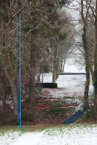 In der simultanen Betrachtung können die blaue Senkrechte und rote Waagerechte als immaterielle Raumlinien erscheinen, die den Blick bewegen: Die Senkrechte nimmt dabei die Geschlossenheit und auch die Aufwärtstendenz der Baumreihe auf, während die Waagerechte diesen Blick insofern rhythmisiert, als sie ihn zunächst auf sich selbst lenkt und sodann über die Schneise auf die Höhenlinie entwirft. Mit der Veränderung des Betrachterstandortes ändert sich auch die Werkerfahrung. Bewegt man sich auf die Treppe zu (die Teil der Arbeit ist), so scheint die rote Waagerechte den Schneisenraum nun zu verschließen; sie zeigt jetzt die Richtungen des parallel zu ihr verlaufenden Waldwegs an.