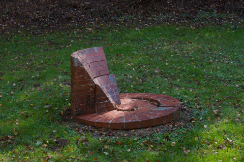 Von Nahem zeigt sich das Bildwerk als Gebautes mit einer klaren Struktur. Aus Ziegelsteinen gemauerte Körper sind additiv zu einer hierarchischen Einheit gefügt: auf zwei, konzentrisch um eine Mittelplatte angelegten, ringförmigen Basen stehen zwei ineinander gestaffelte Kegelschnitte. Dieser architektonisch anmutenden Konstruktion liegen weniger Berechnungen als bildhauerische Vorgehensweisen zugrunde. Denn die Körper, aus denen das Bildwerk zusammengesetzt ist, schnitt Hegewald aus Blöcken heraus, die er aus trapezförmigen Ziegeln aus Westerwälder Ton schichtete. Die Schnitte fassen so die Ziegelelemente zu Formen zusammen. Vor dem Brand werden die Positionen der Elemente in dem jeweiligen Formzusammenhang mithilfe einer eingeritzten Markierung festgehalten; der Aufbau ist hier letztlich ein Wiederaufbau der zuvor durch einen plastischen Prozeß entstandenen Körper.