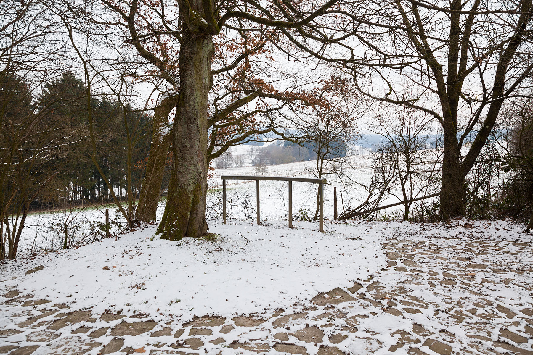 Einladend winkt der Bereich um den Baum, der teilweise von einem kurzen, bogenförmigen Metallgeländer eingefaßt wird. Verführerisch könnte sein Codewort »in Ruhe verweilen, die Aussicht genießen« lauten, würde es sich nicht im selben Augenblick wieder zurücknehmen. Denn gerade die artifiziell trennende wie verbindende Zäsur inmitten der Natur bewirkt ein Innehalten im Akt des sich Hingebens an die Landschaft, im Akt des in sich Aufnehmens der Landschaft. Sie läßt den Betrachter zur Staffagefigur eines Bildes werden, der seinerseits ein Bild betrachtet. Ihm wird der Part des sich nach Ursprünglichkeit sehnenden und Einheit mit den Kräften der Natur suchenden Städters und intellektuellen Kunstliebhabers zugespielt, der aufgeladen mit Vorstellungen und Erwartungen die Szenerie betritt. Der erhabene, pittoreske Punkt und der auf Pittoreskes gelenkte Blick gerinnen ebenso zu Metaphern, wie die wilde, sich frei entfaltende Natur, die sich beim Überdenken des Sachverhaltes wiederum als Klischee entpuppt. Vom Menschen gestaltet, geformt und hinsichtlich seiner Zwecke bearbeitet, tritt sie uns als gezähmte Landschaft, als kulturelles Produkt entgegen.